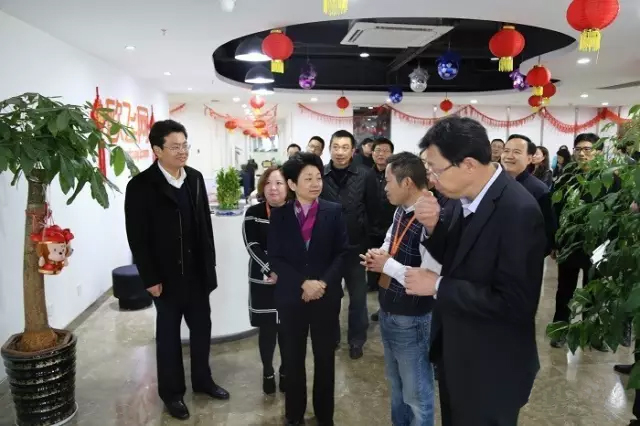 黄书记一行领导重点参观了公司的研发部门,认为研发人员是互联网公司的核心,企业对于研发工作的投入与发展是非常重要的举措。当黄书记走到大厅的时候,对公司大屏中播放的公司简介非常感兴趣,停留下来仔细观看并听取林总的讲解。